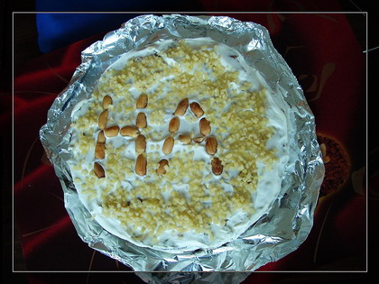 隔了一周高麗妹才做了一個核桃蛋糕給他,差個蠟燭跟真的依樣ㄟ,只差他不會吹....;橋他看蛋糕的神情,目不轉睛的.....,眼睛都不扎一下ㄟ~